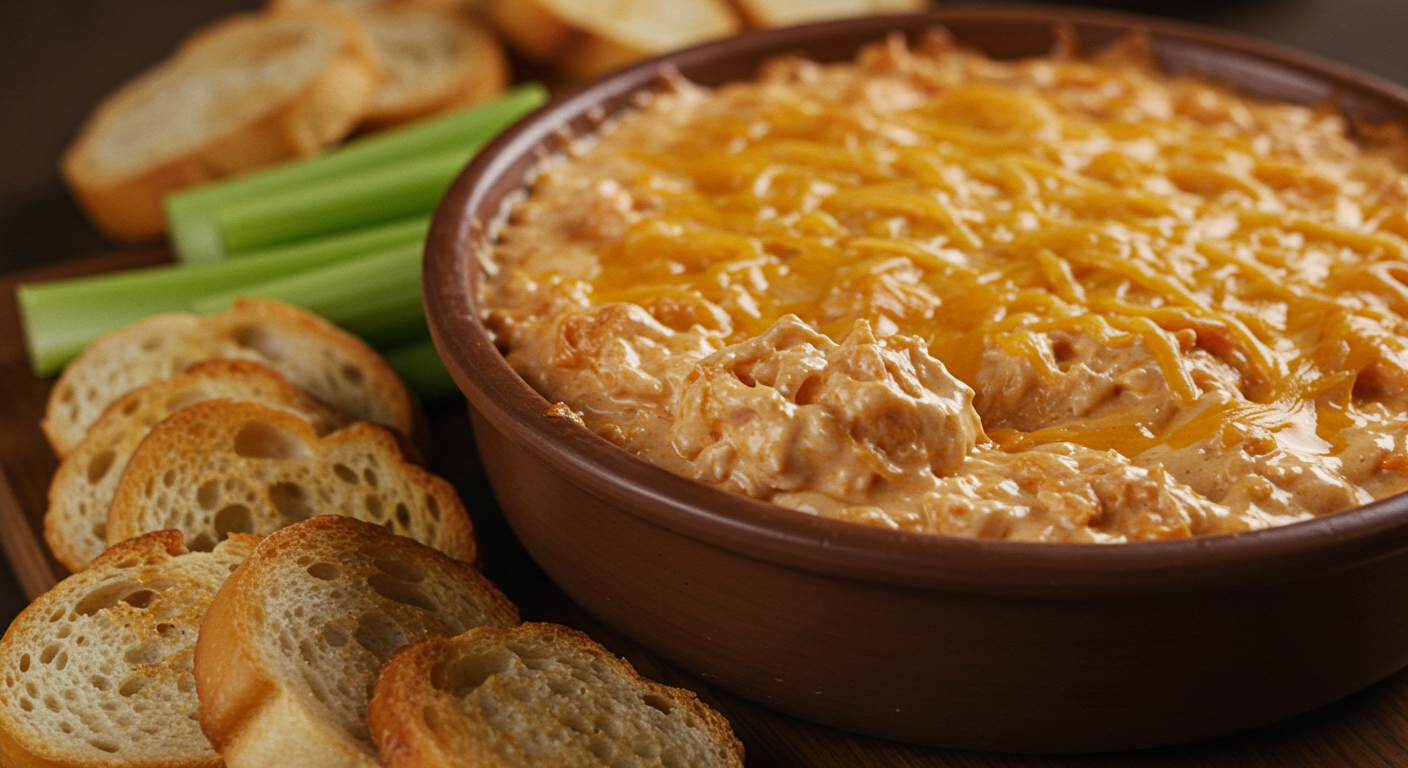 Creamy, cheesy, and spicy, served hot with toasted baguette slices and celery sticks.