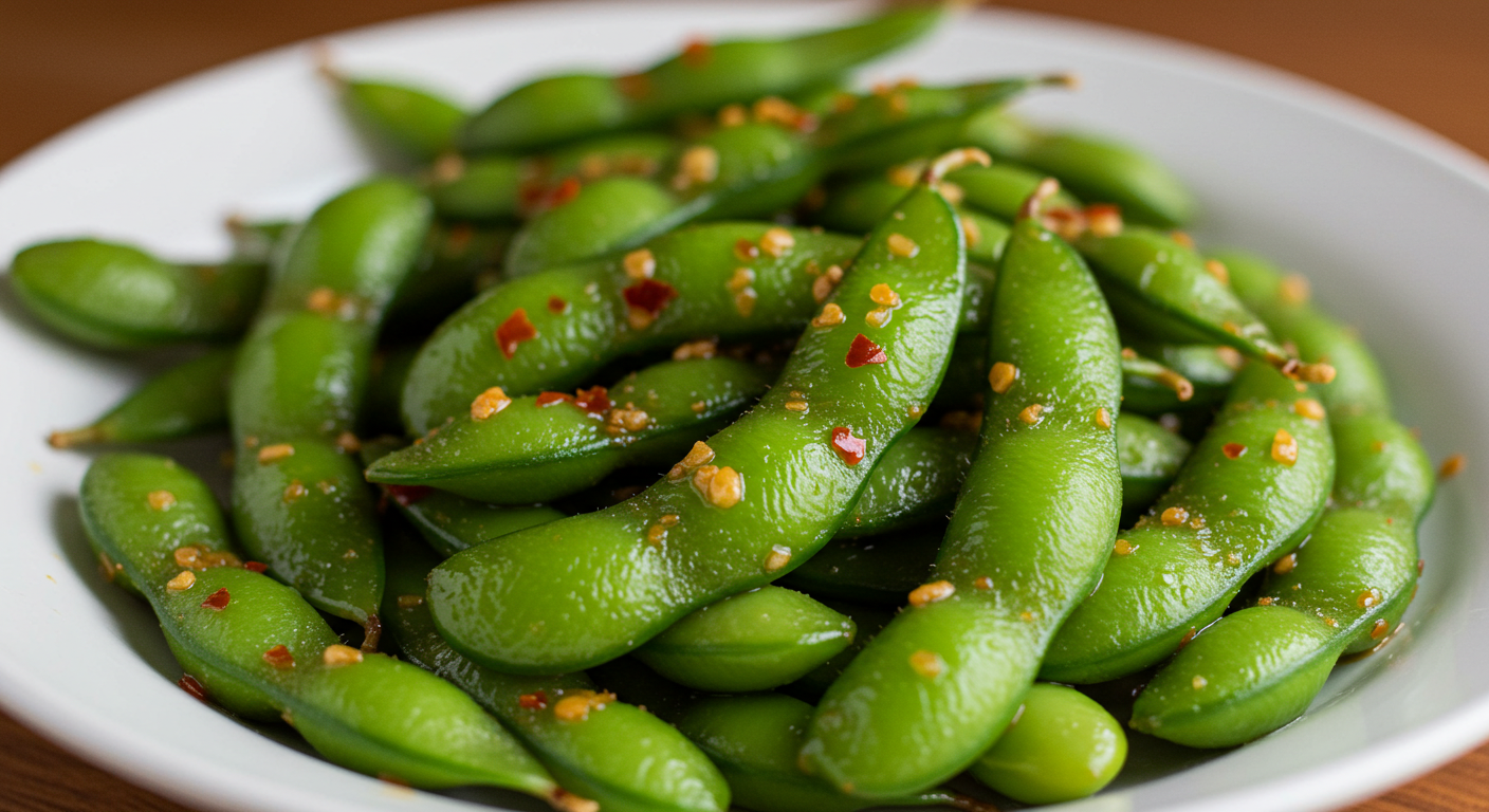 Steamed edamame tossed in a savory and spicy garlic sauce.