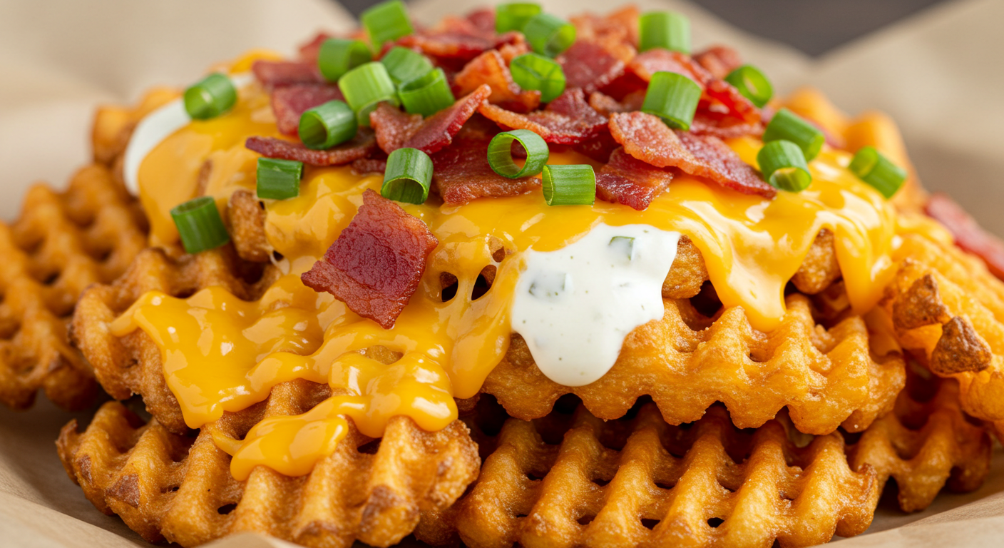 Crispy waffle fries topped with melted cheddar, smoked bacon, green onions, and a zesty ranch drizzle.